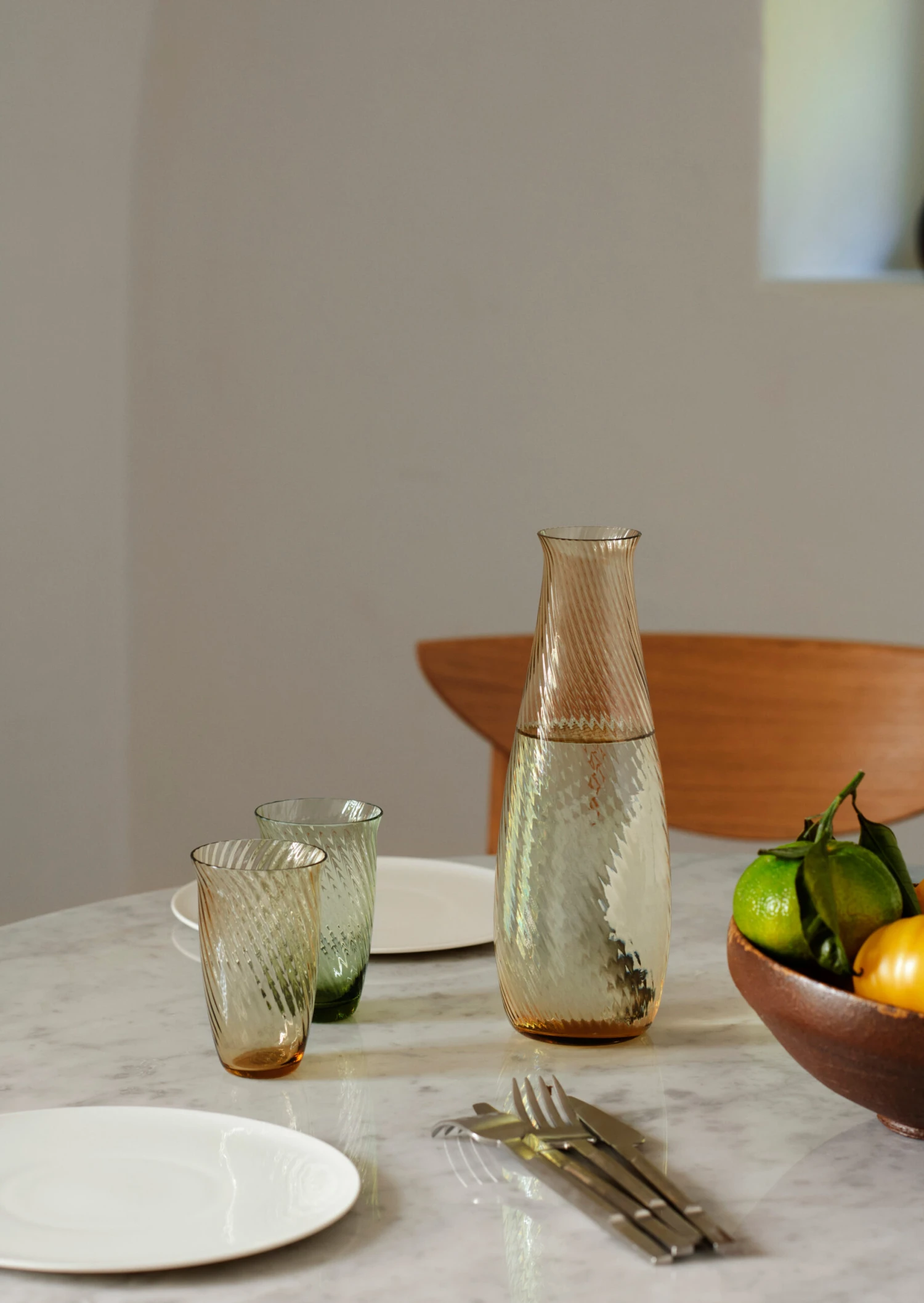 Die stilvolle Collect SC63 Karaffe 0,8 L der dänischen Marke &Tradition besteht aus mundgeblasenem Glas und hat ein wunderschönes Design in Form von weichen diagonalen Streifen, die von wirbelndem Wasser inspiriert wurden. Die Karaffe hat einen praktischen Glaskorken und eine symmetrische klassische Form mit einem sich verjüngenden Hals, sodass Sie sie leicht ausgießen könnend, ohne dabei den Halt zu verlieren. Die schöne Glaskaraffe wurde vom dänischen Designduo Space Copenhagen entworfen und sorgt, in Kombination mit anderen Glasprodukten der Collect Serie, für eine einheitliche Tischdekoration sowohl im Alltag als auch zu festlicheren Anlässen.